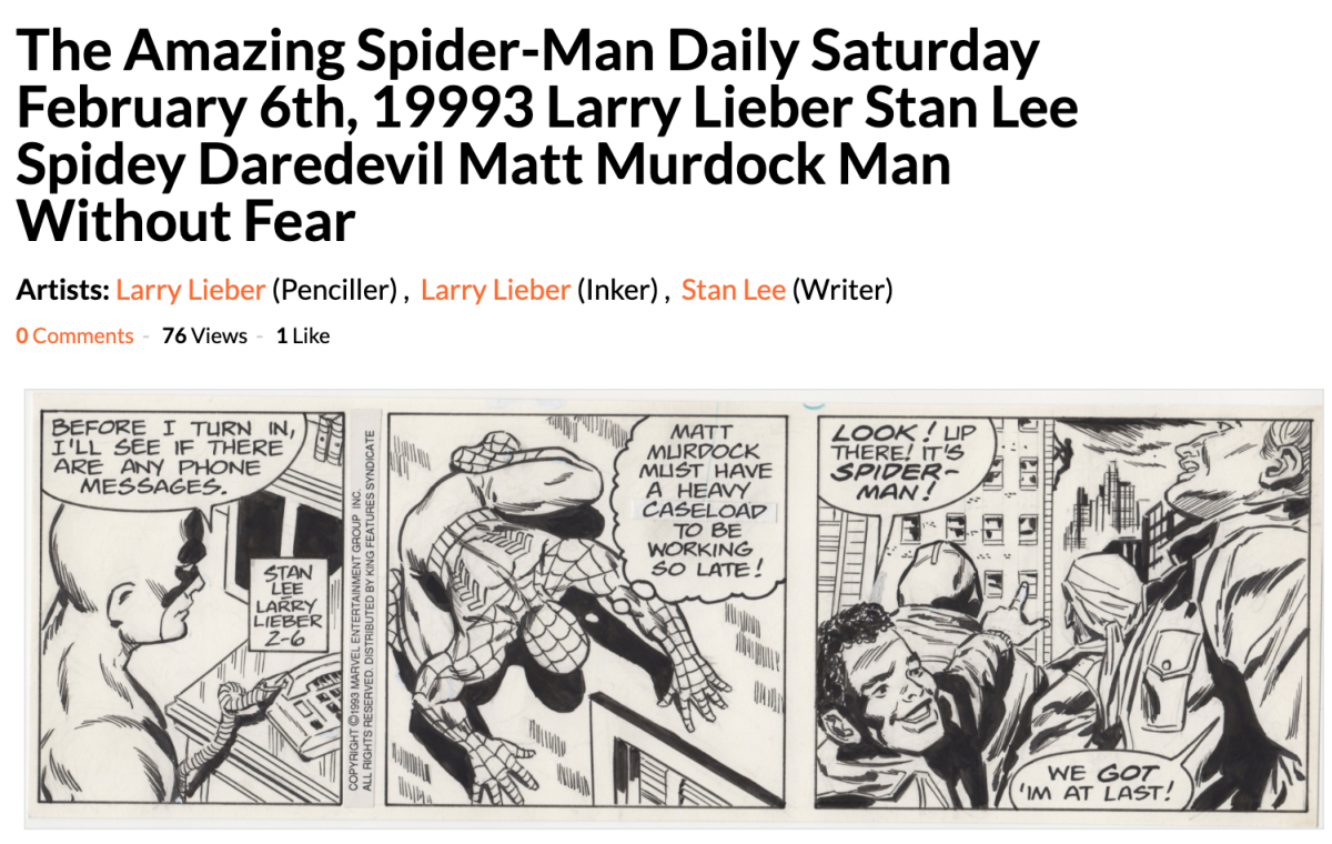 つまりコボちゃんのように新聞紙面において毎日1話ずつ連載されていた『The Amazing Spider-Man』コミックである。このコミックはアース77013にあたり、スパイダーバースにも登場しているのだという。ちなみにMarvel Databaseによれば、77013のピーターさんは作中でGuardian Angel(守護天使)と呼ばれたことがあるとのこと。