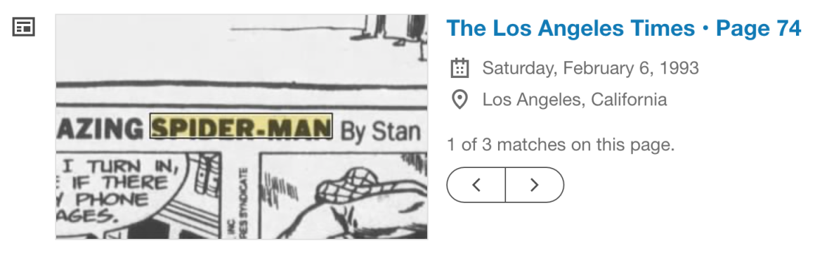 しかし『The Amazing Spider-Man』コミック・ストリップは新聞に掲載されていたわけで、1990年代のアメリカの大手新聞であれば同国の新聞アーカイブサイトやニューヨーク公立図書館でデジタル収録されたものをオンラインで閲覧できる可能性は高い。