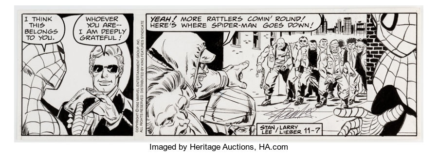 新聞アーカイブサイトから引用すると出典の記載がいろいろと面倒なので(このサイトも一応は遵法精神に則って運営されてるので、出版物の画像や文章を引用する際も引用範囲の限定、出所の明記などある程度は気を遣っている。ただそういうことをしていないtwitterの転載アカウントを引用したりもするのでこのサイトもgeminiを馬鹿にできないほどザル)、正攻法ではないがオークションサイトで発見した『The Amazing Spider-Man』コミック・ストリップのマトピタの画像のリンクをメモ